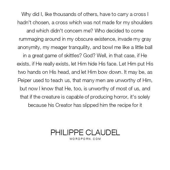Why did I, like thousands of others, have to carry a cross I hadn't chosen, a cross which was not made for my shoulders and which didn't concern me? Who decided to come rummaging around in my obscure existence, invade my gray anonymity, my meager tranquility, and bowl me like a little ball in a great game of skittles? God? Well, in that case, if He exists, if He really exists, let Him hide His face. Let Him put His two hands on His head, and let Him bow down. It may be, as Peiper used to teach us, that many men are unworthy of Him, but now I know that He, too, is unworthy of most of us, and that if the creature is capable of producing horror, it's solely because his Creator has slipped him the recipe for it