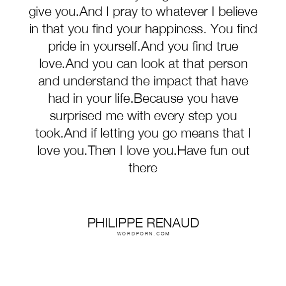 You are worth everything that nature can give you.And I pray to whatever I believe in that you find your happiness. You find pride in yourself.And you find true love.And you can look at that person and understand the impact that have had in your life.Because you have surprised me with every step you took.And if letting you go means that I love you.Then I love you.Have fun out there