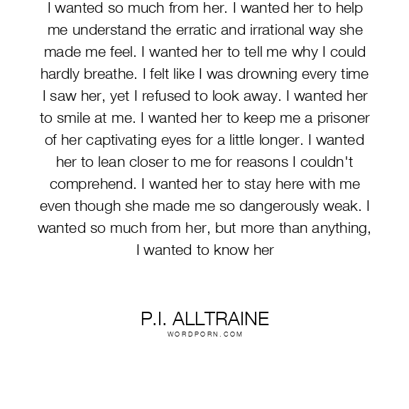 I wanted so much from her. I wanted her to help me understand the erratic and irrational way she made me feel. I wanted her to tell me why I could hardly breathe. I felt like I was drowning every time I saw her, yet I refused to look away. I wanted her to smile at me. I wanted her to keep me a prisoner of her captivating eyes for a little longer. I wanted her to lean closer to me for reasons I couldn't comprehend. I wanted her to stay here with me even though she made me so dangerously weak. I wanted so much from her, but more than anything, I wanted to know her