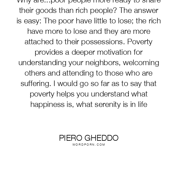 Why are...poor people more ready to share their goods than rich people? The answer is easy: The poor have little to lose; the rich have more to lose and they are more attached to their possessions. Poverty provides a deeper motivation for understanding your neighbors, welcoming others and attending to those who are suffering. I would go so far as to say that poverty helps you understand what happiness is, what serenity is in life