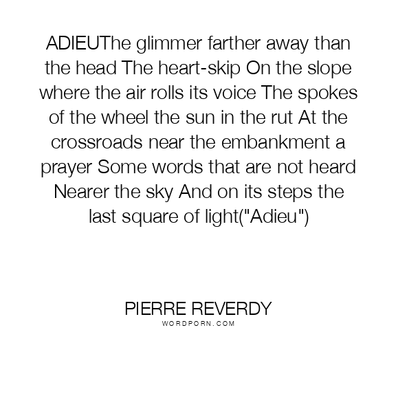 ADIEUThe glimmer farther away than the head The heart-skip On the slope where the air rolls its voice The spokes of the wheel the sun in the rut At the crossroads near the embankment a prayer Some words that are not heard Nearer the sky And on its steps the last square of light("Adieu")