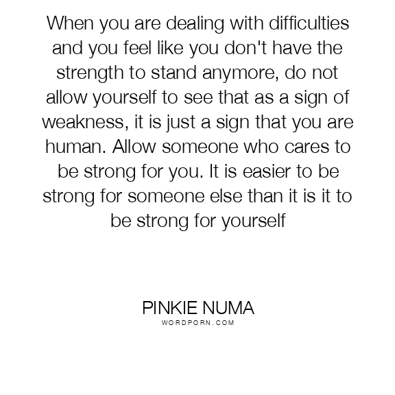 When you are dealing with difficulties and you feel like you don't have the strength to stand anymore, do not allow yourself to see that as a sign of weakness, it is just a sign that you are human. Allow someone who cares to be strong for you. It is easier to be strong for someone else than it is it to be strong for yourself