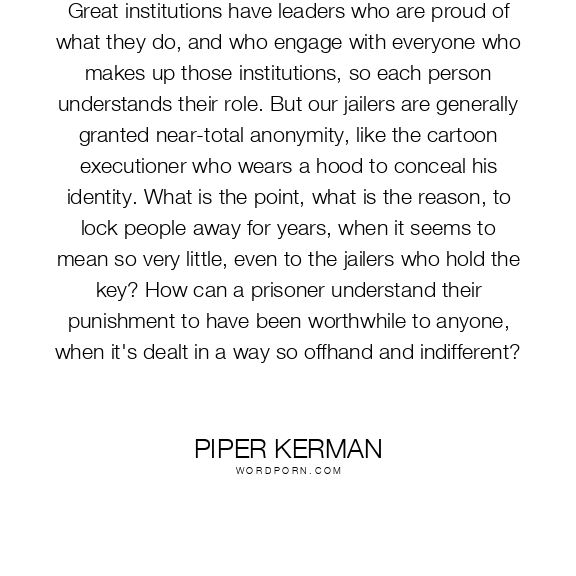 Great institutions have leaders who are proud of what they do, and who engage with everyone who makes up those institutions, so each person understands their role. But our jailers are generally granted near-total anonymity, like the cartoon executioner who wears a hood to conceal his identity. What is the point, what is the reason, to lock people away for years, when it seems to mean so very little, even to the jailers who hold the key? How can a prisoner understand their punishment to have been worthwhile to anyone, when it's dealt in a way so offhand and indifferent?