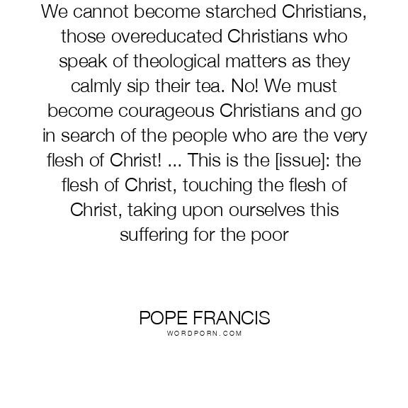 We cannot become starched Christians, those overeducated Christians who speak of theological matters as they calmly sip their tea. No! We must become courageous Christians and go in search of the people who are the very flesh of Christ! ... This is the [issue]: the flesh of Christ, touching the flesh of Christ, taking upon ourselves this suffering for the poor