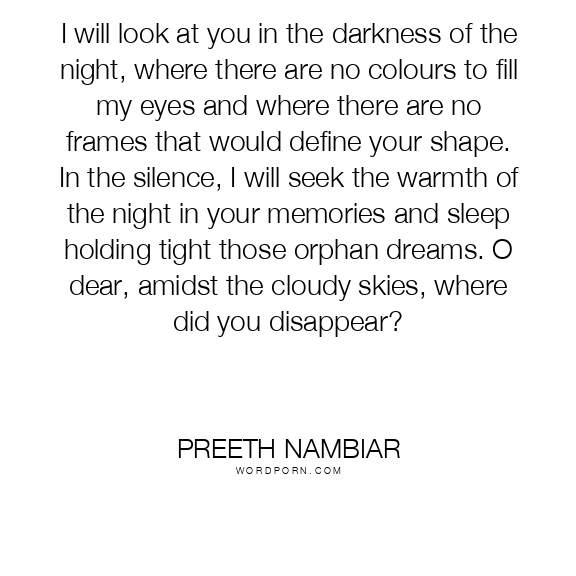 I will look at you in the darkness of the night, where there are no colours to fill my eyes and where there are no frames that would define your shape. In the silence, I will seek the warmth of the night in your memories and sleep holding tight those orphan dreams. O dear, amidst the cloudy skies, where did you disappear?