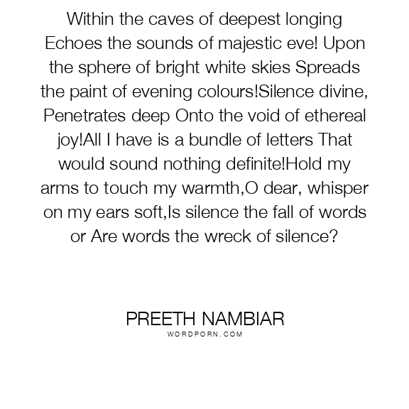 Within the caves of deepest longing Echoes the sounds of majestic eve! Upon the sphere of bright white skies Spreads the paint of evening colours!Silence divine, Penetrates deep Onto the void of ethereal joy!All I have is a bundle of letters That would sound nothing definite!Hold my arms to touch my warmth,O dear, whisper on my ears soft,Is silence the fall of words or Are words the wreck of silence?