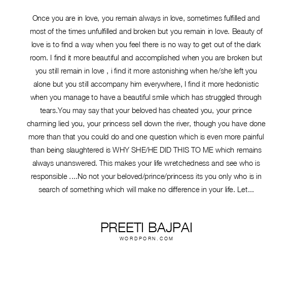 Once you are in love, you remain always in love, sometimes fulfilled and most of the times unfulfilled and broken but you remain in love. Beauty of love is to find a way when you feel there is no way to get out of the dark room. I find it more beautiful and accomplished when you are broken but you still remain in love , i find it more astonishing when he/she left you alone but you still accompany him everywhere, I find it more hedonistic when you manage to have a beautiful smile which has struggled through tears.You may say that your beloved has cheated you, your prince charming lied you, your princess sell down the river, though you have done more than that you could do and one question which is even more painful than being slaughtered is WHY SHE/HE DID THIS TO ME which remains always unanswered. This makes your life wretchedness and see who is responsible ....No not your beloved/prince/princess its you only who is in search of something which will make no difference in your life. Let them go if they want to go, if they are happy with someone else, don't beg for the love, let the love come to you automatically.You deserve to be happy, respected and much better in your life. It is difficult to remain in love when someone suddenly disappear from your life but trust me once you understand that you have really loved them, once you understand that their state of being happy is what you always wished for is more important than that they are with you unhappy or betraying you, once you understand that life has always something better for you, once you understand the value of being lively and happy ,,,,,YOU WON'T HATE HER/HIM AGAIN IN LIFE FOR STABBING YOUR BACK ....FORGIVENESS IS THE BEST MEDICINE FOR THE PEACE OF YOUR HEART & DO REMEMBER YOUR HEART DESERVES PEACE NOT THE PIECES. Love is the best thing you can cater to yourself instead of asking from someone else