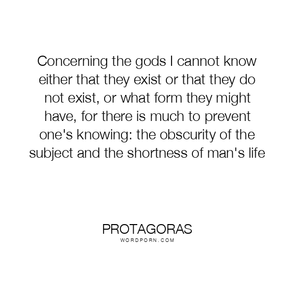 Concerning the gods I cannot know either that they exist or that they do not exist, or what form they might have, for there is much to prevent one's knowing: the obscurity of the subject and the shortness of man's life