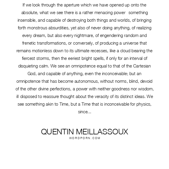If we look through the aperture which we have opened up onto the absolute, what we see there is a rather menacing power--something insensible, and capable of destroying both things and worlds, of bringing forth monstrous absurdities, yet also of never doing anything, of realizing every dream, but also every nightmare, of engendering random and frenetic transformations, or conversely, of producing a universe that remains motionless down to its ultimate recesses, like a cloud bearing the fiercest storms, then the eeriest bright spells, if only for an interval of disquieting calm. We see an omnipotence equal to that of the Cartesian God, and capable of anything, even the inconceivable; but an omnipotence that has become autonomous, without norms, blind, devoid of the other divine perfections, a power with neither goodness nor wisdom, ill-disposed to reassure thought about the veracity of its distinct ideas. We see something akin to Time, but a Time that is inconceivable for physics, since it is capable of destroying without cause or reason, every physical law, just as it is inconceivable for metaphysics, since it is capable of destroying every determinate entity, even a god, even God. This is not a Heraclitean time, since it is not the eternal law of becoming, but rather the eternal and lawless possible becoming of every law. It is a Time capable of destroying even becoming itself by bringing forth, perhaps forever, fixity, stasis, and death