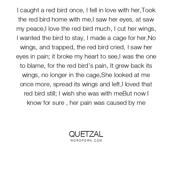 I caught a red bird once, I fell in love with her,Took the red bird home with me,I saw her eyes, at saw my peace,I love the red bird much, I cut her wings, I wanted the bird to stay, I made a cage for her,No wings, and trapped, the red bird cried, I saw her eyes in pain; it broke my heart to see,I was the one to blame, for the red bird’s pain, It grew back its wings, no longer in the cage,She looked at me once more, spread its wings and left,I loved that red bird still; I wish she was with meBut now I know for sure , her pain was caused by me