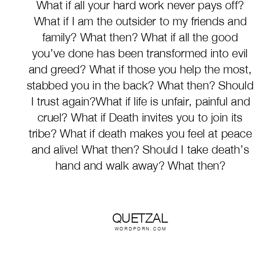 What if all your hard work never pays off? What if I am the outsider to my friends and family? What then? What if all the good you’ve done has been transformed into evil and greed? What if those you help the most, stabbed you in the back? What then? Should I trust again?What if life is unfair, painful and cruel? What if Death invites you to join its tribe? What if death makes you feel at peace and alive! What then? Should I take death’s hand and walk away? What then?