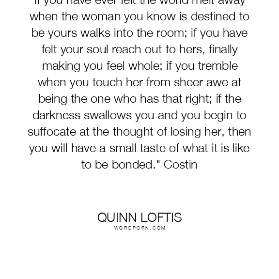 If you have ever felt the world melt away when the woman you know is destined to be yours walks into the room; if you have felt your soul reach out to hers, finally making you feel whole; if you tremble when you touch her from sheer awe at being the one who has that right; if the darkness swallows you and you begin to suffocate at the thought of losing her, then you will have a small taste of what it is like to be bonded." Costin