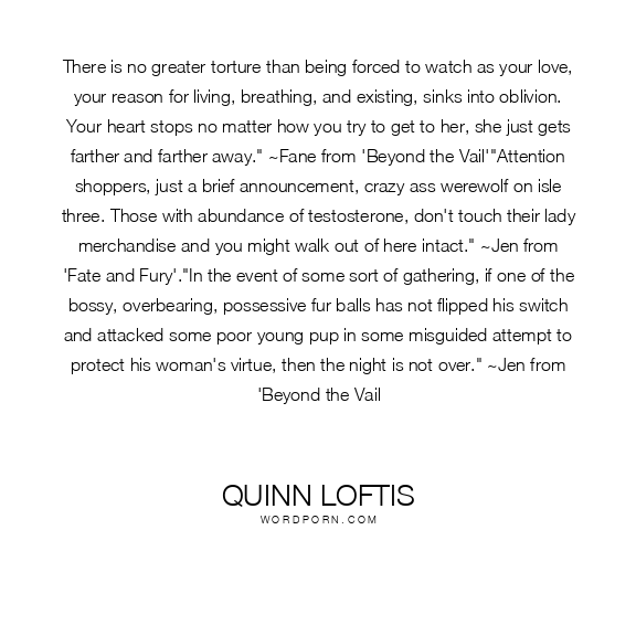 There is no greater torture than being forced to watch as your love, your reason for living, breathing, and existing, sinks into oblivion. Your heart stops no matter how you try to get to her, she just gets farther and farther away." ~Fane from 'Beyond the Vail'"Attention shoppers, just a brief announcement, crazy ass werewolf on isle three. Those with abundance of testosterone, don't touch their lady merchandise and you might walk out of here intact." ~Jen from 'Fate and Fury'."In the event of some sort of gathering, if one of the bossy, overbearing, possessive fur balls has not flipped his switch and attacked some poor young pup in some misguided attempt to protect his woman's virtue, then the night is not over." ~Jen from 'Beyond the Vail