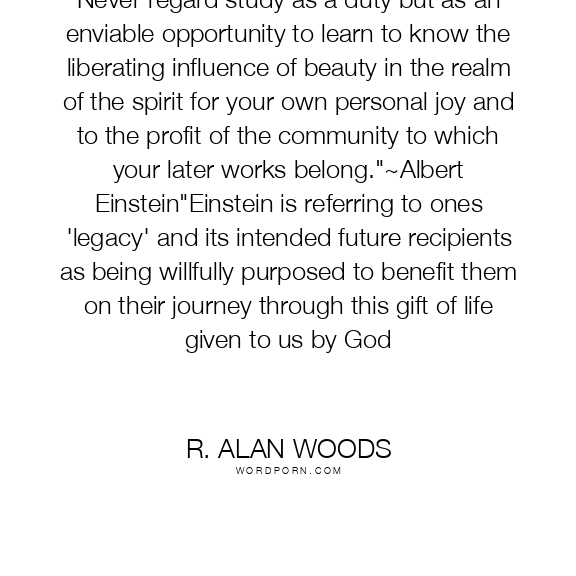 R. Alan Woods quote. Never regard study as a duty but as an enviable opportunity to learn to know the liberating influence of beauty in the realm of the spirit for your own personal joy and to the profit of the community to which your later works belong.