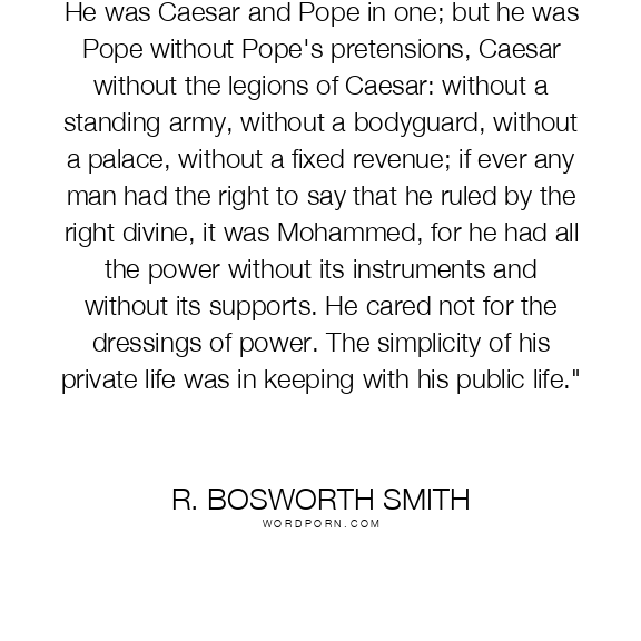 He was Caesar and Pope in one; but he was Pope without Pope's pretensions, Caesar without the legions of Caesar: without a standing army, without a bodyguard, without a palace, without a fixed revenue; if ever any man had the right to say that he ruled by the right divine, it was Mohammed, for he had all the power without its instruments and without its supports. He cared not for the dressings of power. The simplicity of his private life was in keeping with his public life."
