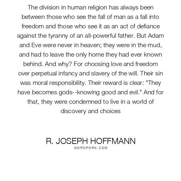 The division in human religion has always been between those who see the fall of man as a fall into freedom and those who see it as an act of defiance against the tyranny of an all-powerful father. But Adam and Eve were never in heaven; they were in the mud, and had to leave the only home they had ever known behind. And why? For choosing love and freedom over perpetual infancy and slavery of the will. Their sin was moral responsibility. Their reward is clear: "They have becomes gods--knowing good and evil." And for that, they were condemned to live in a world of discovery and choices