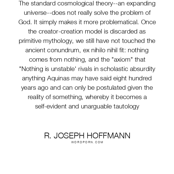The standard cosmological theory--an expanding universe--does not really solve the problem of God. It simply makes it more problematical. Once the creator-creation model is discarded as primitive mythology, we still have not touched the ancient conundrum, ex nihilo nihil fit: nothing comes from nothing, and the "axiom" that "Nothing is unstable' rivals in scholastic absurdity anything Aquinas may have said eight hundred years ago and can only be postulated given the reality of something, whereby it becomes a self-evident and unarguable tautology