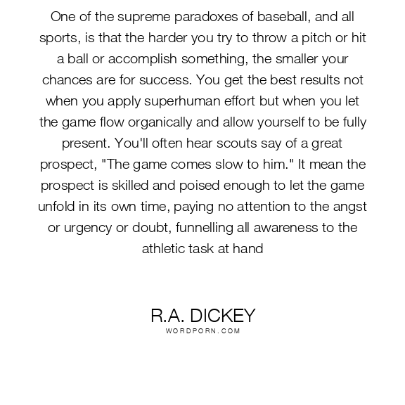 One of the supreme paradoxes of baseball, and all sports, is that the harder you try to throw a pitch or hit a ball or accomplish something, the smaller your chances are for success. You get the best results not when you apply superhuman effort but when you let the game flow organically and allow yourself to be fully present. You'll often hear scouts say of a great prospect, "The game comes slow to him." It mean the prospect is skilled and poised enough to let the game unfold in its own time, paying no attention to the angst or urgency or doubt, funnelling all awareness to the athletic task at hand