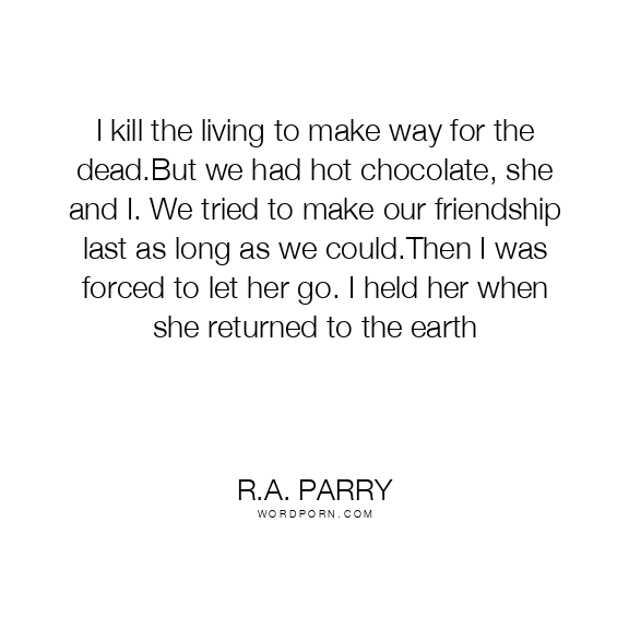 I kill the living to make way for the dead.But we had hot chocolate, she and I. We tried to make our friendship last as long as we could.Then I was forced to let her go. I held her when she returned to the earth