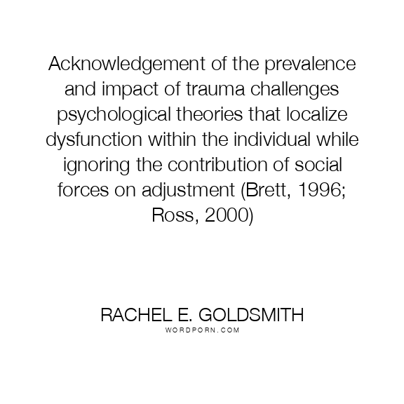 Acknowledgement of the prevalence and impact of trauma challenges psychological theories that localize dysfunction within the individual while ignoring the contribution of social forces on adjustment (Brett, 1996; Ross, 2000)