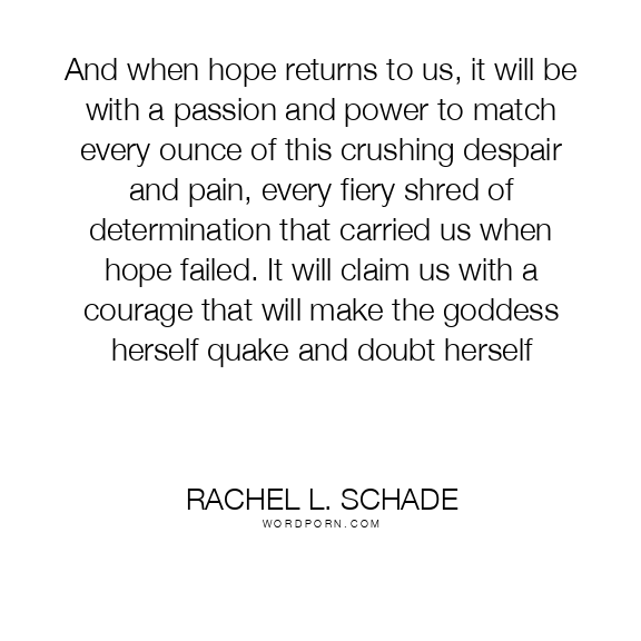 And when hope returns to us, it will be with a passion and power to match every ounce of this crushing despair and pain, every fiery shred of determination that carried us when hope failed. It will claim us with a courage that will make the goddess herself quake and doubt herself