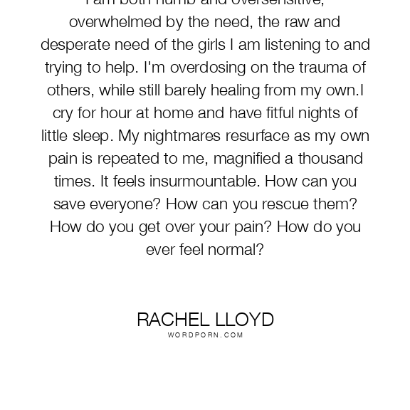 I am both numb and oversensitive, overwhelmed by the need, the raw and desperate need of the girls I am listening to and trying to help. I'm overdosing on the trauma of others, while still barely healing from my own.I cry for hour at home and have fitful nights of little sleep. My nightmares resurface as my own pain is repeated to me, magnified a thousand times. It feels insurmountable. How can you save everyone? How can you rescue them? How do you get over your pain? How do you ever feel normal?