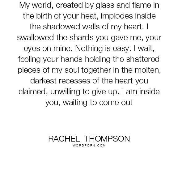My world, created by glass and flame in the birth of your heat, implodes inside the shadowed walls of my heart. I swallowed the shards you gave me, your eyes on mine. Nothing is easy. I wait, feeling your hands holding the shattered pieces of my soul together in the molten, darkest recesses of the heart you claimed, unwilling to give up. I am inside you, waiting to come out