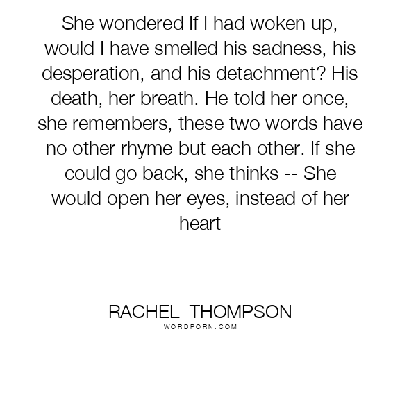 She wondered If I had woken up, would I have smelled his sadness, his desperation, and his detachment? His death, her breath. He told her once, she remembers, these two words have no other rhyme but each other. If she could go back, she thinks -- She would open her eyes, instead of her heart