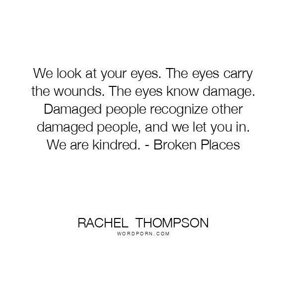 We look at your eyes. The eyes carry the wounds. The eyes know damage. Damaged people recognize other damaged people, and we let you in. We are kindred. - Broken Places