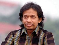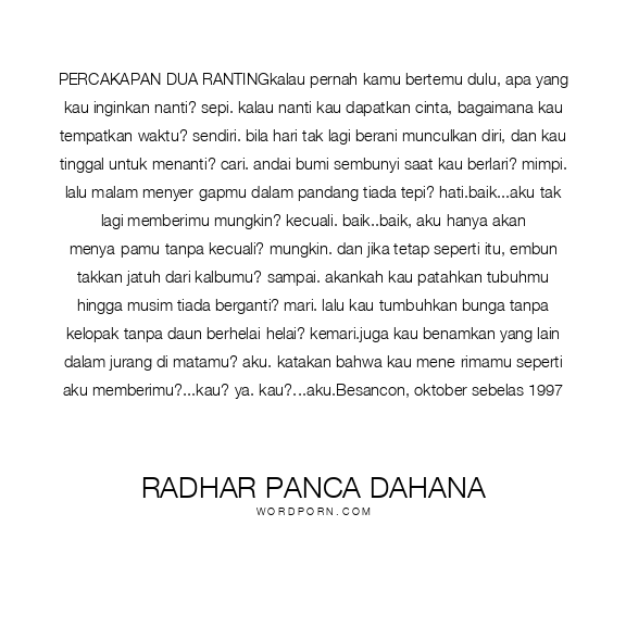 PERCAKAPAN DUA RANTINGkalau pernah kamu bertemu dulu, apa yang kau inginkan nanti? sepi. kalau nanti kau dapatkan cinta, bagaimana kau tempatkan waktu? sendiri. bila hari tak lagi berani munculkan diri, dan kau tinggal untuk menanti? cari. andai bumi sembunyi saat kau berlari? mimpi. lalu malam menyer-gapmu dalam pandang tiada tepi? hati.baik...aku tak lagi memberimu mungkin? kecuali. baik..baik, aku hanya akan menya-pamu tanpa kecuali? mungkin. dan jika tetap seperti itu, embun takkan jatuh dari kalbumu? sampai. akankah kau patahkan tubuhmu hingga musim tiada berganti? mari. lalu kau tumbuhkan bunga tanpa kelopak tanpa daun berhelai-helai? kemari.juga kau benamkan yang lain dalam jurang di matamu? aku. katakan bahwa kau mene-rimamu seperti aku memberimu?...kau? ya. kau?...aku.Besancon, oktober sebelas 1997
