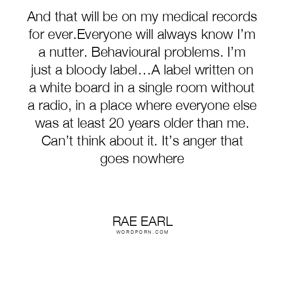 And that will be on my medical records for ever.Everyone will always know I’m a nutter. Behavioural problems. I’m just a bloody label…A label written on a white board in a single room without a radio, in a place where everyone else was at least 20 years older than me. Can’t think about it. It’s anger that goes nowhere
