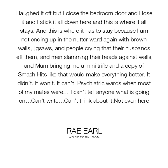 I laughed it off but I close the bedroom door and I lose it and I stick it all down here and this is where it all stays. And this is where it has to stay because I am not ending up in the nutter ward again with brown walls, jigsaws, and people crying that their husbands left them, and men slamming their heads against walls, and Mum bringing me a mini trifle and a copy of Smash Hits like that would make everything better. It didn’t. It won’t. It can’t. Psychiatric wards when most of my mates were….I can’t tell anyone what is going on…Can’t write…Can’t think about it.Not even here