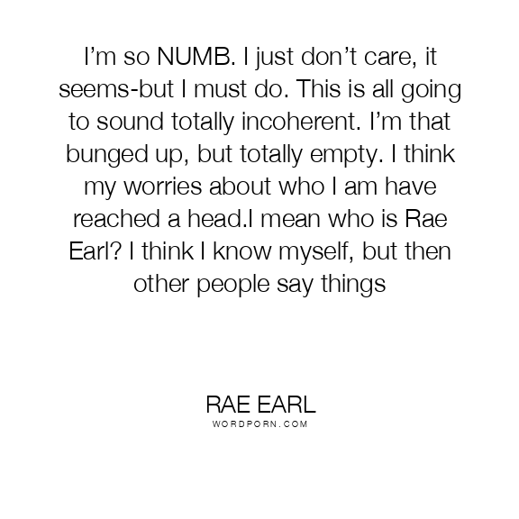 I’m so NUMB. I just don’t care, it seems-but I must do. This is all going to sound totally incoherent. I’m that bunged up, but totally empty. I think my worries about who I am have reached a head.I mean who is Rae Earl? I think I know myself, but then other people say things