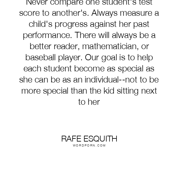 Never compare one student's test score to another's. Always measure a child's progress against her past performance. There will always be a better reader, mathematician, or baseball player. Our goal is to help each student become as special as she can be as an individual--not to be more special than the kid sitting next to her