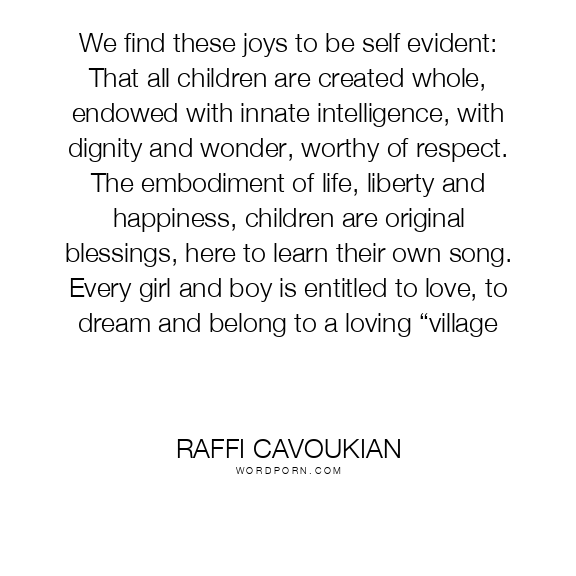 We find these joys to be self evident: That all children are created whole, endowed with innate intelligence, with dignity and wonder, worthy of respect. The embodiment of life, liberty and happiness, children are original blessings, here to learn their own song. Every girl and boy is entitled to love, to dream and belong to a loving “village