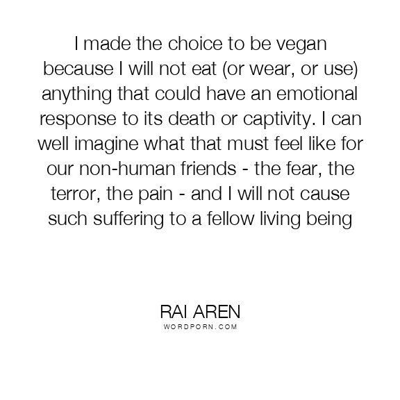 I made the choice to be vegan because I will not eat (or wear, or use) anything that could have an emotional response to its death or captivity. I can well imagine what that must feel like for our non-human friends - the fear, the terror, the pain - and I will not cause such suffering to a fellow living being