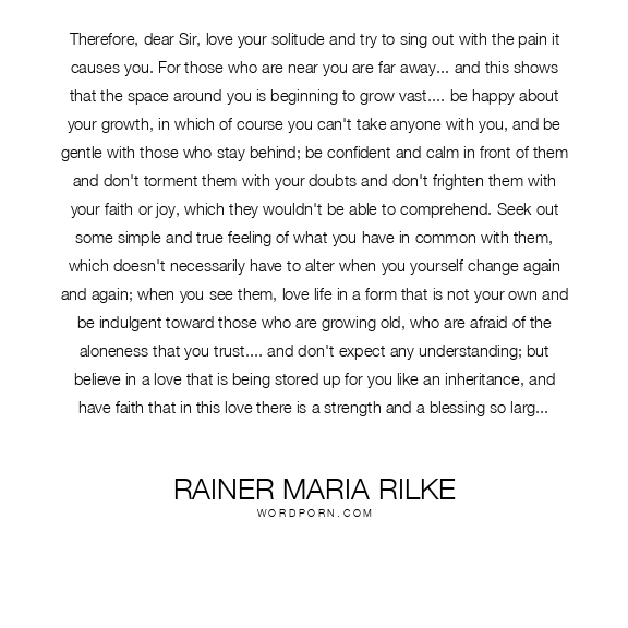 Therefore, dear Sir, love your solitude and try to sing out with the pain it causes you. For those who are near you are far away... and this shows that the space around you is beginning to grow vast.... be happy about your growth, in which of course you can't take anyone with you, and be gentle with those who stay behind; be confident and calm in front of them and don't torment them with your doubts and don't frighten them with your faith or joy, which they wouldn't be able to comprehend. Seek out some simple and true feeling of what you have in common with them, which doesn't necessarily have to alter when you yourself change again and again; when you see them, love life in a form that is not your own and be indulgent toward those who are growing old, who are afraid of the aloneness that you trust.... and don't expect any understanding; but believe in a love that is being stored up for you like an inheritance, and have faith that in this love there is a strength and a blessing so large that you can travel as far as you wish without having to step outside it