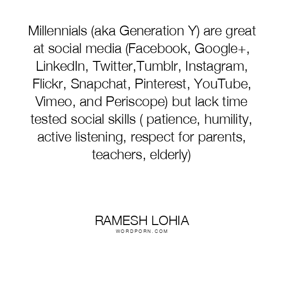 Millennials (aka Generation Y) are great at social media (Facebook, Google+, LinkedIn, Twitter,Tumblr, Instagram, Flickr, Snapchat, Pinterest, YouTube, Vimeo, and Periscope) but lack time tested social skills ( patience, humility, active listening, respect for parents, teachers, elderly)