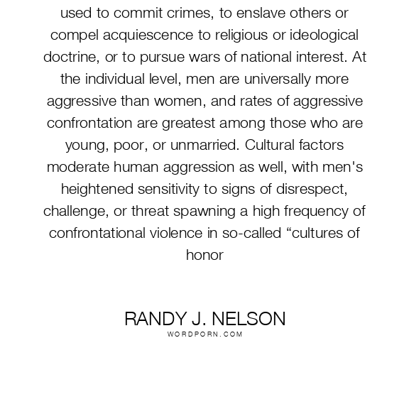 It is also only in humans that aggression may be used to commit crimes, to enslave others or compel acquiescence to religious or ideological doctrine, or to pursue wars of national interest. At the individual level, men are universally more aggressive than women, and rates of aggressive confrontation are greatest among those who are young, poor, or unmarried. Cultural factors moderate human aggression as well, with men's heightened sensitivity to signs of disrespect, challenge, or threat spawning a high frequency of confrontational violence in so-called “cultures of honor