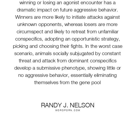 winning or losing an agonist encounter has a dramatic impact on future aggressive behavior. Winners are more likely to initiate attacks against unknown opponents, whereas losers are more circumspect and likely to retreat from unfamiliar conspecifics, adopting an opportunistic strategy, picking and choosing their fights. In the worst case scenario, animals socially subjugated by constant threat and attack from dominant conspecifics develop a submissive phenotype, showing little or no aggressive behavior, essentially eliminating themselves from the gene pool