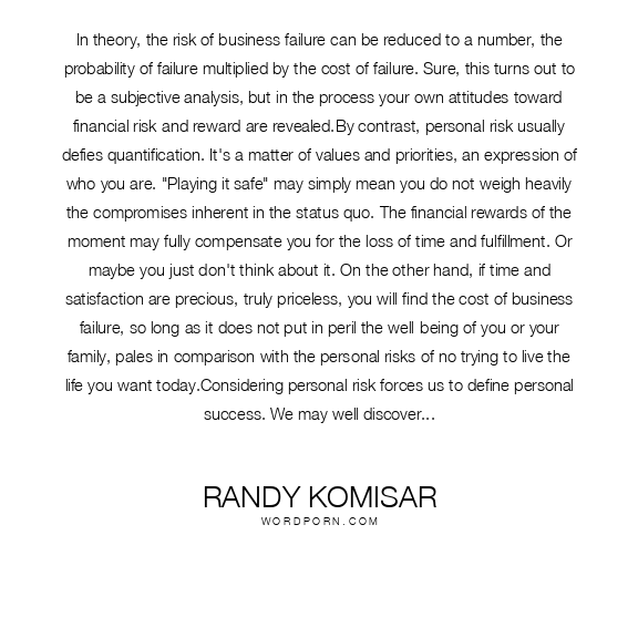 In theory, the risk of business failure can be reduced to a number, the probability of failure multiplied by the cost of failure. Sure, this turns out to be a subjective analysis, but in the process your own attitudes toward financial risk and reward are revealed.By contrast, personal risk usually defies quantification. It's a matter of values and priorities, an expression of who you are. "Playing it safe" may simply mean you do not weigh heavily the compromises inherent in the status quo. The financial rewards of the moment may fully compensate you for the loss of time and fulfillment. Or maybe you just don't think about it. On the other hand, if time and satisfaction are precious, truly priceless, you will find the cost of business failure, so long as it does not put in peril the well-being of you or your family, pales in comparison with the personal risks of no trying to live the life you want today.Considering personal risk forces us to define personal success. We may well discover that the business failure we avoid and the business success we strive for do not lead us to personal success at all. Most of us have inherited notions of "success" from someone else or have arrived at these notions by facing a seemingly endless line of hurdles extending from grade school through college and into our careers. We constantly judge ourselves against criteria that others have set and rank ourselves against others in their game. Personal goals, on the other hand, leave us on our own, without this habit of useless measurement and comparison.Only the Whole Life Plan leads to personal success. It has the greatest chance of providing satisfaction and contentment that one can take to the grave, tomorrow. In the Deferred Life Plan there will always be another prize to covet, another distraction, a new hunger to sate. You will forever come up short