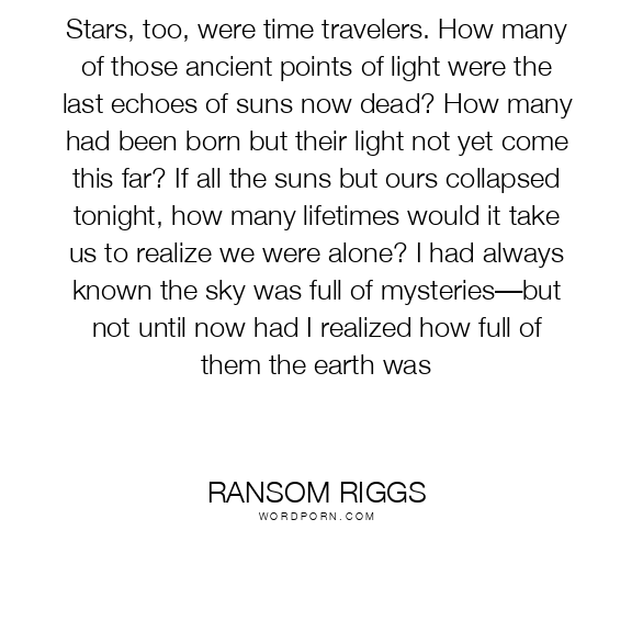 Stars, too, were time travelers. How many of those ancient points of light were the last echoes of suns now dead? How many had been born but their light not yet come this far? If all the suns but ours collapsed tonight, how many lifetimes would it take us to realize we were alone? I had always known the sky was full of mysteries—but not until now had I realized how full of them the earth was