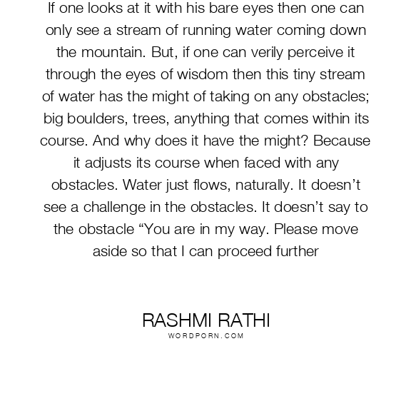 If one looks at it with his bare eyes then one can only see a stream of running water coming down the mountain. But, if one can verily perceive it through the eyes of wisdom then this tiny stream of water has the might of taking on any obstacles; big boulders, trees, anything that comes within its course. And why does it have the might? Because it adjusts its course when faced with any obstacles. Water just flows, naturally. It doesn’t see a challenge in the obstacles. It doesn’t say to the obstacle “You are in my way. Please move aside so that I can proceed further