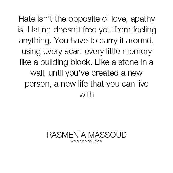 Hate isn’t the opposite of love, apathy is. Hating doesn’t free you from feeling anything. You have to carry it around, using every scar, every little memory like a building block. Like a stone in a wall, until you’ve created a new person, a new life that you can live with
