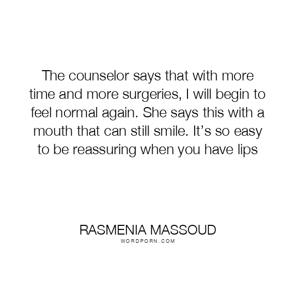 The counselor says that with more time and more surgeries, I will begin to feel normal again. She says this with a mouth that can still smile. It’s so easy to be reassuring when you have lips