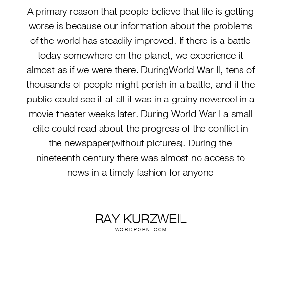 A primary reason that people believe that life is getting worse is because our information about the problems of the world has steadily improved. If there is a battle today somewhere on the planet, we experience it almost as if we were there. DuringWorld War II, tens of thousands of people might perish in a battle, and if the public could see it at all it was in a grainy newsreel in a movie theater weeks later. During World War I a small elite could read about the progress of the conflict in the newspaper(without pictures). During the nineteenth century there was almost no access to news in a timely fashion for anyone
