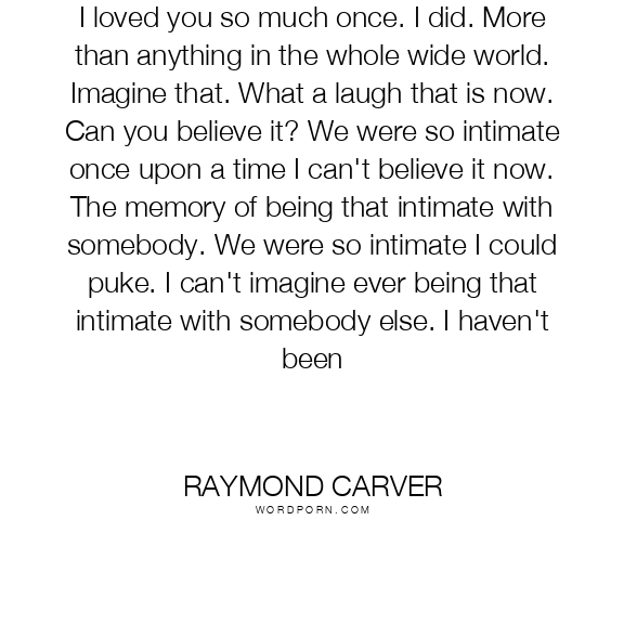 I loved you so much once. I did. More than anything in the whole wide world. Imagine that. What a laugh that is now. Can you believe it? We were so intimate once upon a time I can't believe it now. The memory of being that intimate with somebody. We were so intimate I could puke. I can't imagine ever being that intimate with somebody else. I haven't been