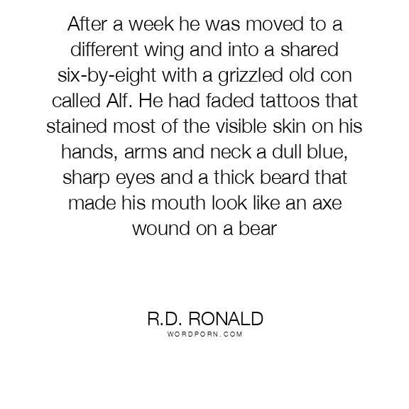 After a week he was moved to a different wing and into a shared six-by-eight with a grizzled old con called Alf. He had faded tattoos that stained most of the visible skin on his hands, arms and neck a dull blue, sharp eyes and a thick beard that made his mouth look like an axe wound on a bear
