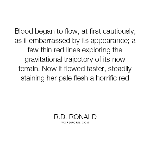 Blood began to flow, at first cautiously, as if embarrassed by its appearance; a few thin red lines exploring the gravitational trajectory of its new terrain. Now it flowed faster, steadily staining her pale flesh a horrific red