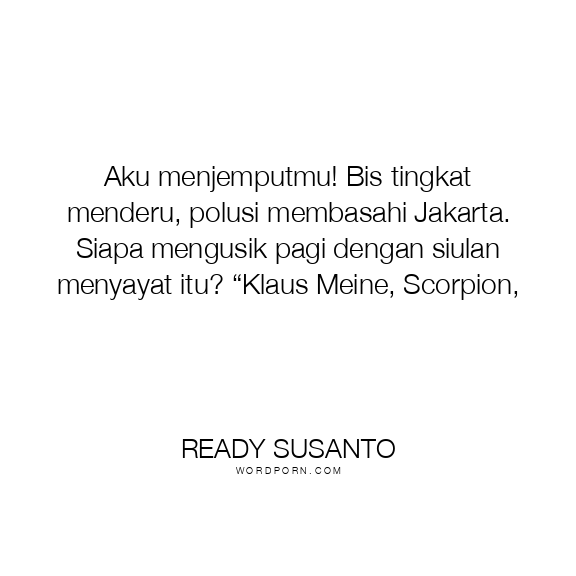 Aku menjemputmu! Bis tingkat menderu, polusi membasahi Jakarta. Siapa mengusik pagi dengan siulan menyayat itu? “Klaus Meine, Scorpion,